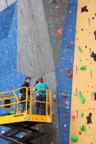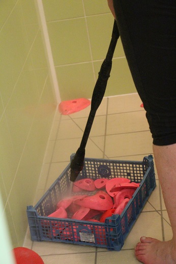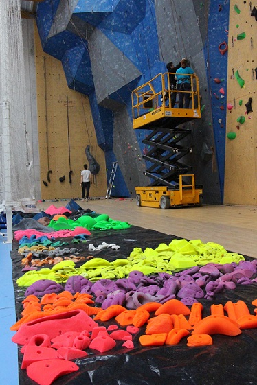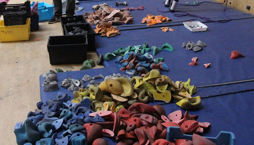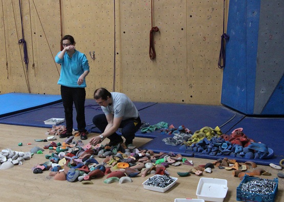 Aujourd’hui, début des préparatifs pour le championnat de diff du 31 mars prochain : le démontage du mur. Après 6 heures de boulot, les prises sont toutes par terre et les 2/3 sont propres !